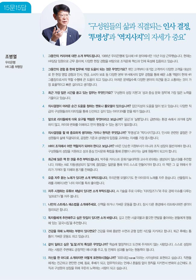 120¿© ³âÀÇ ±ä ¿ª»ç¸¦ Áö´Ñ ¿ì¸®ÀºÇàÀÌ °í°´ Áß½ÉÀÇ ±ÝÀ¶ ¼ºñ½º¸¦ ¹ÙÅÁÀ¸·Î ±¹³»¿Ü¿¡¼ ½Å·Ú¹Þ´Â ±Û·Î¹ú ÀºÇàÀ¸·Î ¼ºÀåÇϱâ±îÁö´Â ¹«¾ùº¸´Ù °í°´°úÀÇ »ó»ýÀ» À̲ø¾î¿Â ³»ºÎ ÀÎÀçµéÀÇ ¿ªÇÒÀÌ ÄÇ´Ù. ¿ì¸®ÀºÇà¿¡¼´Â ³»ºÎ ÀÎÀçµéÀ» '¿Ã¹Ù¸¥ ǰ¼ºÀ» °¡Áø µµÀüÀûÀ̰í âÀÇÀûÀÎ ÃÖ°íÀÇ ±ÝÀ¶ Àü¹®°¡'·Î ¾ç¼ºÇÔÀ¸·Î½á, °í°´ÀÇ ³»ÀÏÀ» ÇÔ²²ÇÏ´Â ÆÄÆ®³Ê·Î ÀÚ¸®¸Å±èÇϰíÀÚ Çϸç, À̸¦ À§ÇØ HR±×·ì¿¡¼´Â Á¶Á÷ °æÀï·Â °È, °Ç°ÇÑ ¼º°ú Á᫐ ÀÎ»ç¹®È Á¤Âø, ¹Ì·¡ °æÀï·Â È®º¸¶ó´Â ¼¼ °¡Áö ÇÙ½É ¸ñÇ¥¸¦ Áß½ÉÀ¸·Î ÀλçÀü·«À» ¿î¿ëÇϰí ÀÖ´Ù. Á¶º´¿ ¿ì¸®ÀºÇà HR±×·ì ºÎÇàÀåÀº "¿ì¸®ÀºÇà HR±×·ìÀº ´Ü¼øÇÑ Àλç Áö¿ø ¾÷¹«¿¡ ¸Ó¹°Áö ¾Ê°í, ±ÝÀ¶ Àü¹®°¡·Î¼ÀÇ ±¸¼º¿ø ¼ºÀå Áö¿ø, ÀÎ»ç¹®È Çõ½Å, »çȸÀû Ã¥ÀÓ ºÎ¹®À» ¾Æ¿ï·¯ ÄɾîÇϰí ÀÖ´Ù"¸ç "±¸¼º¿øµéÀÌ Á÷¹« Àü¹®°¡·Î ¼ºÀåÇÒ ¼ö Àִ ȯ°æÀ» ¸¸µé°í, ÀÏ ÀßÇÏ´Â ±¸¼º¿øÀÌ ÀÎÁ¤¹Þ´Â Àλ繮ȸ¦ Á¶Á÷ ³»¿¡ Á¤Âø½ÃÅ´À¸·Î½á ¿ì¸®ÀºÇàÀÇ Áö¼Ó°¡´ÉÇÑ ¼ºÀåÀ» µ½´Â ÇϳªÀÇ ÃàÀ¸·Î ÀÚ¸®¸Å±èÇϰíÀÚ ÇÑ´Ù"°í ¹àÇû´Ù. ![]() ±ÝÀ¶ Àü¹®°¡·Î¼ÀÇ ¼ºÀå Áö¿ø Á¶Á÷ÀÇ ¼ºÀåÀ» À̲ø±â À§Çؼ´Â °á±¹ ±¸¼º¿ø °³°³ÀÎÀÇ ¼ºÀåÀÌ ±â¹ÝµÅ¾ß ÇÑ´Ù. ÀÌ¿¡ µû¶ó ¿ì¸®ÀºÇàÀº ±¸¼º¿øµéÀÌ Á¶Á÷ ³»¿¡¼ ±ÝÀ¶ Àü¹®°¡·Î ¼ºÀåÇÒ ¼ö ÀÖµµ·Ï ´Ù°¢ÀûÀÎ Áö¿øÃ¥À» ¸¶·ÃÇØ ¿î¿µÇϰí ÀÖ´Ù. °¡Àå ´ëÇ¥ÀûÀÎ Áö¿øÃ¥À¸·Î´Â ¿ÃÇØ óÀ½ ½ÃÇà¿¡ ³ª¼± »ç³» Á÷¹« ¼Ò°³ Çà»çÀÎ '¿ì¸® Ä¿¸®¾î ¿¢½ºÆ÷'°¡ ÀÖ´Ù. ¿ì¸® Ä¿¸®¾î ¿¢½ºÆ÷´Â ±¸¼º¿øµéÀÇ Á÷¹« ÀÌÇØµµ¸¦ ³ôÀ̰í ÀÚ±âÁÖµµÀûÀÎ °æ·Â ¼ºÀå °æ·Î ¼³°è¸¦ Áö¿øÇϱâ À§ÇØ ¸¶·ÃµÈ Çà»ç·Î, º»ºÎ ºÎ¼¿¡¼ ±Ù¹«ÇÏ´Â ÇöÁ÷ÀÚµéÀÌ ¾÷¹«¿Í °ü·ÃÇØ ÀÏ´ëÀÏ·Î Á¶¾ðÀ» Á¦°øÇÏ´Â ÇöÁ÷ÀÚ »ó´ãºÎ½º»Ó¸¸ ¾Æ´Ï¶ó, Àü¹® Àη ¾ç¼º °úÁ¤¿¡ ´ëÇÑ ¾È³», ¿ì¼ö ¿µ¾÷ ÀÎÀç°¡ ÁøÇàÇÏ´Â ¸àÅ丵 µî ´Ù¾çÇÑ ÇÁ·Î±×·¥ÀÌ ¿î¿µµÅ ±¸¼º¿øµéÀÇ Å« È£ÀÀÀ» ¹Þ¾Ò´Ù. Çà»ç¿¡´Â 500¿© ¸íÀÇ ±¸¼º¿øµéÀÌ Âü¿©Çߴµ¥, ±×Áß¿¡¼µµ ÀÔ»ç 5³â À̳»ÀÎ Çà¿øµéÀÌ ´Ù¼ö Âü¿©ÇØ Ãʱâ Ä¿¸®¾î¸¦ Á¡°ËÇϰí, ½º½º·ÎÀÇ ¼ºÀå ¹æÇâÀ» ¼³°èÇÏ´Â ½Ã°£À» °¡Á³´Ù. »Ó¸¸ ¾Æ´Ï¶ó, '¿ì¸® Å©¶ó¿î Á¦µµ'µµ ¿ÃÇØ ½Å¼³µÈ ¼ºÀå Áö¿ø Á¦µµ´Ù. ¿ì¸® Å©¶ó¿î Á¦µµ´Â ÀºÇà ³»¿Ü¿¡¼ ¿ì¼öÇÑ ¼º°ú¸¦ ÀÎÁ¤¹Þ¾Æ ´Ù¼öÀÇ ¼ö»óÀ» ÇÑ ±¸¼º¿øµéÀÌ ÀںνÉÀ» °®°í ´õ ¸¹Àº ¼º°ú¸¦ âÃâÇØ ³¾ ¼ö ÀÖµµ·Ï Àå·ÁÇϰíÀÚ ¸¶·ÃµÈ Á¦µµ´Ù. ÀÔ»ç ÈÄ ÃÑ ¼ö»ó Ƚ¼ö°¡ 15ȸ ÀÌ»óÀÎ ±¸¼º¿øµé Áß ¿ì¼öÀÚ¸¦ ¼±Á¤, ¼±Á¤µÈ ±¸¼º¿ø Àü¿ø¿¡°Ô Ưº° Æ÷»ó±ÝÀ» Áö±ÞÇϰí, Á÷¿ø Á¶È¸ ½Ã Ÿ Á÷¿øÀÌ ¼±Á¤ ¿©ºÎ¸¦ ¾Ë ¼ö ÀÖµµ·Ï Á¶È¸ ȸ鿡 'ÀÎÁ¤ ¾ÆÀÌÄÜ'À» Ç¥±âÇß´Ù. ƯÈ÷ Á÷±Þº° 1À§ Á÷¿ø¿¡°Ô´Â 1È£ºÀ Ưº°½Â±ÞÀ̶ó´Â ÆÄ°ÝÀûÀÎ ÇýÅÃÀ» Á¦°øÇß´Ù. ´õºÒ¾î ²ÙÁØÇÑ Àڱⰳ¹ß·Î ´Ù¼öÀÇ ÀÚ°ÝÁõÀ» ÃëµæÇÑ ±¸¼º¿øµéÀ» ¿ì´ëÇϰíÀÚ '¿ì¸® ¿¤¸®Æ® Á¦µµ'µµ ½Å¼³ÇØ ¿î¿µ ÁßÀÌ´Ù. ¾÷¹« ¿¬°ü¼ºÀÌ ³ôÀº ÀÚ°ÝÁõÀ» 10°³ ÀÌ»ó º¸À¯ÇÑ ±¸¼º¿øµéÀ» ´ë»óÀ¸·Î ¼ö»óÀÚ¸¦ ¼±Á¤ÇØ ½Ã»óÇϰí, 'ÀÎÁ¤ ¾ÆÀÌÄÜ'µµ ºÎ¿©Çϰí ÀÖ´Ù. °¢ Á÷±Þº° 1À§ Á÷¿ø¿¡°Ô´Â MBA ¿¬¼ö ¼±¹ß ¿ì´ë, ÇØ¿Ü ÁÖ¿ä ¹Ú¶÷ȸ Âü°ü ±âȸ¸¦ ºÎ¿©ÇØ À̵éÀÌ ´õ¿í Æø³ÐÀº °æÇèÀ» ½×À» ¼ö ÀÖµµ·Ï Áö¿øÇϰí ÀÖ´Ù. À̹ۿ¡ ÇöÀç ¿î¿µµÇ°í ÀÖ´Â ¼ºÀå Áö¿ø Á¦µµ·Î´Â 'Àڱⰳ¹ß 縰Áö'°¡ ÀÖ´Ù. ÀÌ´Â ¿¬ÃÊ¿¡ ±¸¼º¿øµéÀÌ Á÷Á¢ °³Àκ° ¿¬¼ö ¹× ÀÚ°ÝÁõ ¸ñÇ¥¸¦ ¼³Á¤Çϰí, À̸¦ ´Þ¼ºÇÑ °³¼ö¿¡ µû¶ó Á¶Á÷¿¡¼ Ưº° Æ÷»óÀ» Á¦°øÇÏ´Â Á¦µµ´Ù. ¿¬¼ö Âü¿©µµ, ¿¬¼ö ¼ºÀû, Àڱⰳ¹ß 縰Áö ´Þ¼º·ü µîÀ» Á¾ÇÕÆò°¡ÇØ ¿ì¼ö Á÷¿øÀ» º°µµ ½Ã»óÇÔÀ¸·Î½á ±¸¼º¿øµéÀÇ Àڱⰳ¹ßÀ» Àû±ØÀûÀ¸·Î Àå·ÁÇϰí ÀÖ´Ù. Á¶º´¿ ºÎÇàÀåÀº "¿ì¸®ÀºÇàÀº ´Ü±â°£ÀÇ ¾÷ÀûÀÌ ¾Æ´Ñ Àå±âÀûÀÎ ¼ºÀåÀ» Àå·ÁÇÏ´Â ÀÎ»ç ¿ì´ë Á¤Ã¥À» °ÈÇϰí ÀÖ´Ù"¸ç "À̸¦ ÅëÇØ ±¸¼º¿ø ½º½º·Î ±ÝÀ¶ Àü¹®°¡·Î¼ ¼ºÀåÇϵµ·Ï µ½°í, ±Ã±ØÀûÀ¸·Î´Â Á¶Á÷ °æÀï·Â °È·Î À̾îÁö´Â ¼±¼øÈ¯ÀÇ ±¸Á¶¸¦ È®¸³ÇϰíÀÚ ÇÑ´Ù"°í ÀüÇß´Ù. ¼º°ú Á᫐ ¹®È Á¶¼ºÀ» À§ÇÑ ÀλçÁ¦µµ Çõ½Å µðÁöÅÐ ±ÝÀ¶À¸·ÎÀÇ °Ýº¯ ¼Ó¿¡¼ Á¶Á÷ÀÇ ¼ºÀåÀ» °ßÀÎÇϰíÀÚ, ¿ì¸®ÀºÇà HR±×·ìÀº °ÇÀüÇÑ ¼º°ú Á᫐ Á¶Á÷¹®È Á¶¼ºÀ» À§ÇÑ ÀλçÁ¦µµ Çõ½ÅÀ» ÁøÇàÇϰí ÀÖ´Ù. À̸¦ À§ÇØ Áö³ÇØ ½Åãæ ÀλçÆò°¡Á¦µµ¸¦ µµÀÔ, °øÁ¤ÇÑ Æò°¡ ȯ°æ°ú °Ç°ÇÑ Á¶Á÷¹®È¸¦ ¸