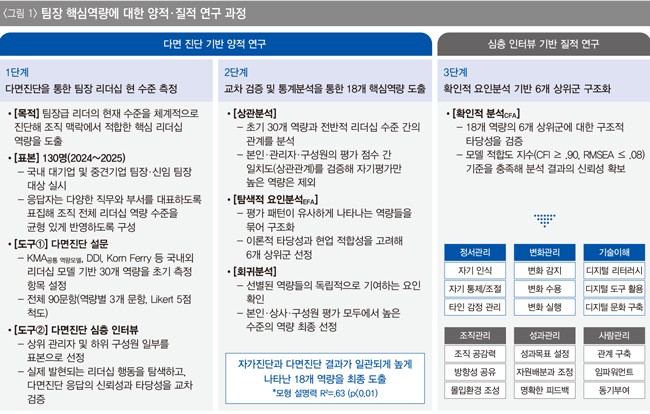 ±¹³» ±â¾÷Àº ¿À·§µ¿¾È ¿¬°ø Á᫐ ¿î¿µÀ» À¯ÁöÇØ ¿ÔÁö¸¸, µô·ÎÀÌÆ®ÀÇ '2025 Global Human Capital Trends'¿¡¼ ÁöÀûÇÏµí ºÒÈ®½Ç¼º°ú ±â¼ú º¯È, Á¶Á÷¹®È ÀçÆíÀÌ ±âÁ¸ ¸®´õ½Ê ¸ðµ¨À» ´õ ÀÌ»ó À¯È¿ÇÏÁö ¾Ê°Ô ¸¸µé°í ÀÖ´Ù. ½ÇÁ¦·Î ´É·ÂÁÖÀÇ ±â¹ÝÀÇ ¼±¹ß°ú ¹èÄ¡, ºü¸¥ ¼¼´ë±³Ã¼, Á¶±â ÆÀÀå ¹ßŹÀÌ µ¿½Ã¿¡ ÁøÇàµÇ¸ç ¿¬°ø ü°è¿Í ´É·ÂÁÖÀÇ Ã¼°èÀÇ Ãæµ¹ÀÌ ÆÀÀåÀÇ Á¤¼Àû¡¤±¸Á¶Àû ºÎ´ãÀ» Ű¿ì°í ÀÖ´Ù. ¹®Á¦ÀÇ ÇÙ½ÉÀº º¹À⼺ ÀÚü°¡ ¾Æ´Ï¶ó, Á¶Á÷ÀÇ ¸®´õ½Ê ¿î¿µ ü°è°¡ º¹À⼺ Áõ°¡ ¼Óµµ¸¦ µû¶ó°¡Áö ¸øÇϰí ÀÖ´Ù´Â Á¡ÀÌ´Ù. ÆÀÀåÀÇ ¿ªÇÒÀº ±âÇϱ޼öÀûÀ¸·Î ´Ã¾úÁö¸¸ À̸¦ ÁöÁöÇÒ Á¦µµ¿Í Áö¿ø ±¸Á¶´Â ¿©ÀüÈ÷ Æò¸éÀû ¼öÁØ¿¡ ¸Ó¹°·¯ ÀÖ´Ù. ÀÌ·Î ÀÎÇØ ÆÀÀåÀº Á¤¼Àû ÇÇ·Î, °ü°è ¾Ð·Â, ¾÷¹« °úÁßÀ̶ó´Â »ïÁß ºÎ´ãÀ» °Þ°í ÀÖ´Ù. ÀÌ·¯ÇÑ ±¸Á¶Àû ¾Ð·ÂÀÌ °¡ÇØÁö¸é¼ ±¹³»¿¡¼µµ °ü¸®ÀÚ Á÷Ã¥ ȸÇÇ Çö»ó, Áï '¸®´õ Æ÷ºñ¾ÆLeader Phobia'°¡ È®»êµÇ°í ÀÖ´Ù. ´ÜÀ§ Á¶Á÷ ¼º°ú Ã¥ÀÓ, ±¸¼º¿ø °ü¸®, Á¤¼Àû ¾ÈÁ¤°¨ Á¦°øÀ̶ó´Â ´ÙÃþÀû ¿ä±¸°¡ ÇÑ °³Àο¡°Ô ÁýÁߵǸé¼, ¸®´õ°¡ µÇ°íÀÚ ÇÏ´Â µ¿±â°¡ ¾àȵǴ °ÍÀÌ´Ù. Áö±Ý Á¶Á÷ÀÌ ¸¶ÁÖÇÑ ¹®Á¦´Â 'ÁÁÀº ÆÀÀåÀÌ ¾ø´Ù'´Â °ÍÀÌ ¾Æ´Ï¶ó 'ÁÁÀº ÆÀÀåÀÌ ³ª¿Ã ¼ö ÀÖ´Â ½Ã½ºÅÛÀÌ ¾ø´Ù'´Â ±¸Á¶Àû °áÇÌ¿¡ °¡±õ´Ù. µû¶ó¼ ¿ì¸®´Â "º¹À⼺ÀÇ ½Ã´ë¿¡ Á¶Á÷Àº ¾î¶² ¸®´õ½Ê ±¸Á¶¸¦ ¼³°èÇØ¾ß Áö¼Ó°¡´É¼ºÀ» È®º¸ÇÒ ¼ö Àִ°¡?"¶ó´Â Áú¹®¿¡¼ Ãâ¹ßÇØ¾ß ÇÑ´Ù. ![]() ÀÚü ¿¬±¸¸¦ ÅëÇÑ '¿ªÇÒ º¹À⼺'ÀÇ ½ÇÁõÀû °ËÁõ ÇÊÀÚ´Â 2024³â 10¿ù, KMAÀÇ 450¿© ȸ¿ø»ç ±³À°¡¤Àλç´ã´çÀÚ¸¦ ´ë»óÀ¸·Î ÆÀÀå¿¡°Ô ¿ä±¸µÇ´Â ¿ªÇÒ º¯È¸¦ ÆÄ¾ÇÇϱâ À§ÇÑ ¼³¹®À» ½Ç½ÃÇß´Ù. ºÐ¼® °á°ú °øÁ¤ÇÑ Æò°¡¿Í Çǵå¹é(51%), °¨Á¤À̳ª ½ºÆ®·¹½º Á¶Àý°ú °°Àº ÀÚ±â°ü¸®(45%), µ¿±âºÎ¿©(40%), ÆÀ ºÐÀ§±â Á¶¼º(35%), Æ®·»µå³ª ±â¼úÀ» ÆÄ¾ÇÇÏ´Â º¯È°ü¸®(25%)¿Í °ü·ÃµÈ ÆÀÀåÀÇ ¿ªÇÒÀÌ Áß¿äÇÏ´Ù´Â °á°ú°¡ ³ª¿Ô´Ù. ÀÌ·Î½á ¸®´õ½Ê, Á¶Á÷°ü¸®, ¼º°ú°ü¸® µî ±âÁ¸¿¡ ¸®´õµéÀÌ ¸Ã°í ÀÖ´ø ÇÙ½É ¿ªÇÒ ¿Ü¿¡µµ ÀÚ±â°ü¸®³ª Æ®·»µå, ±â¼úÀ» Àд º¯È°ü¸®¿Í °°Àº '³»Àû ¿ª·®'ÀÌ »õ·Ó°Ô ºÎ»óÇϰí ÀÖÀ½À» È®ÀÎÇÒ ¼ö ÀÖ¾ú´Ù. À̾î 2025³â 3¿ù, ÇÊÀÚ°¡ 2024³âºÎÅÍ ±¹³» ´ë±â¾÷¡¤Áß°ß±â¾÷°ú ¼öÇàÇÑ ÆÀÀ塤½ÅÀÓÆÀÀå ÇÁ·ÎÁ§Æ®ÀÇ »çÀü ÀÎÅÍºä ºÐ¼®¿¡¼µµ À¯ÀǹÌÇÑ ÆÐÅÏÀÌ µå·¯³µ´Ù. ÆÀÀå Á÷Ã¥Àڵ鿡°Ô ¿ªÇÒ ¼öÇàÀÇ ÁÖ¿ä ¾î·Á¿òÀ» ¹¯ÀÚ, ½Ç¹« ¾÷¹« °úÁß(55%), ±¸¼º¿ø°úÀÇ °ü°è ¼³Á¤ ¹× °ü¸®(52%), °¨Á¤ ¹× ½ºÆ®·¹½º °ü¸®(46%), Æò°¡ ¹× Çǵå¹é(43%), ¸ñÇ¥ ¼³Á¤ ¹× ¹èºÐ(30%) ¼øÀ¸·Î °íÃæÀ» È£¼ÒÇß´Ù. Áï À̵éÀº ¿ªÇÒÀÇ º¹À⼺°ú ±â´ë ¼öÁØÀÇ °¡ÆÄ¸¥ »ó½ÂÀ¸·Î ¾÷¹« °úÁß, Á¤¼Àû ¾Ð¹Ú, °ü°èÀû ºÎ´ãÀÌ µ¿½ÃÀûÀ¸·Î Áõ°¡ÇÏ´Â ´ÙÃþÀû ½ºÆ®·¹½º ±¸Á¶¸¦ °æÇèÇϰí ÀÖÀ¸¸ç, ÀÌ´Â ¸®´õ Æ÷ºñ¾Æ Çö»óÀ¸·Î±îÁö È®ÀåµÇ°í ÀÖ´Ù. ÀÌ °°Àº ¼³¹®°ú ÀÎÅÍºä °á°ú¸¦ Á¾ÇÕÇϸé, Á¶Á÷ÀÌ ±â´ëÇÏ´Â ¿ªÇÒ°ú ÆÀÀåÀÌ ½ÇÁ¦·Î °¨´çÇÒ ¼ö ÀÖ´Â ¿ª·®¡¤ÀÚ¿ø °£¿¡´Â ¸íÈ®ÇÑ ¿ªÇÒ °£±ØRole GapÀÌ Á¸ÀçÇϸç, ÀÌ´Â ¸®´õ Æ÷ºñ¾Æ È®»êÀÇ ±¸Á¶Àû ¿øÀÎÀ¸·Î ÀÛµ¿Çϰí ÀÖ¾ú´Ù. ƯÈ÷ º¯È°ü¸®, ÀÚ±â°ü¸®, Á¶Á÷°ü¸®, »ç¶÷°ü¸®, ¼º°ú°ü¸® µî ÆÀÀå¿¡°Ô ºÎ°úµÇ´Â ¿ªÇÒÀº ÀÌÁ¦ ´Ü¼øÇÑ °ü¸® ¾÷¹«¸¦ ³Ñ¾î Á¤¼-±â¼ú-Á¶Á÷-¼º°ú-°ü°è°¡ ±³Â÷ÇÏ´Â º¹ÇÕ ±¸Á¶ÀÇ ¿ªÇÒ·Î ´Ùº¯ÈµÇ°í ÀÖ´Ù. ±×·³¿¡µµ ºÒ±¸Çϰí À̸¦ ÁöÁöÇÏ´Â Á¦µµ¿Í ÀÚ¿ø, µµ±¸´Â ÃæºÐÈ÷ ¸¶·ÃµÇÁö ¾Ê¾Æ ¿ªÇÒ º¹À⼺Àº Áõ°¡ÇÏ´Â ¹Ý¸é, ±¸Á¶Àû ±â¹ÝÀº Á¤Ã¼µÈ ºÒ±ÕÇü »óŰ¡ Áö¼ÓµÇ°í ÀÖ´Ù. ÇØ´ç ÁöÁ¡¿¡¼ÀÇ ¹®Á¦´Â 'ÆÀÀå °³ÀÎÀÇ ¿ª·® ºÎÁ·'ÀÌ ¾Æ´Ï¶ó, 'Á¶Á÷ÀÌ ¾î¶² ±âÁذú ±¸Á¶·Î ÆÀÀåÀ» À°¼º ¹× Áö¿øÇϴ°¡'¶ó´Â ½Ã½ºÅÛÀû Áú¹®À¸·Î ÀüȯµÈ´Ù. ÇÊÀÚ´Â ÀÌ·¯ÇÑ Áú¹®¿¡ ´äÇϱâ À§ÇØ 2024³âºÎÅÍ 2025³â±îÁö 2³â¿¡ °ÉÃÄ ±¹³» ´ë±â¾÷ ÆÀÀå ¹× ½ÅÀÓ ÆÀÀå 130¸íÀ» ´ë»óÀ¸·Î ´Ù¸éÁø´Ü ±â¹ÝÀÇ ¾çÀû ¿¬±¸¿Í ½ÉÃþ ÀÎÅÍºä ±â¹ÝÀÇ ÁúÀû ¿¬±¸¸¦ ÅëÇÕÇÑ È¥ÇÕ ¿¬±¸¸¦ ¼öÇàÇØ ÆÀÀåÀÇ Çٽɿª·®À» Á¤±³È÷ ±Ô¸íÇß´Ù. ¾çÀû ¿¬±¸¿¡¼´Â Çѱ¹´É·üÇùȸ ¸ðµ¨°ú DDI³ª Äܯ䏮 µî ±Û·Î¹ú ¸®´õ½Ê ¸ðµ¨À» ÅëÇÕÇØ Ãʱâ 30°³ ¿ª·®À» ¼³Á¤Çϰí, »ó»ç¡¤º»ÀΡ¤±¸¼º¿ø ´Ù¸éÆò°¡ µ¥ÀÌÅ͸¦ Ȱ¿ëÇØ »ó°üºÐ¼® ¡æ Ž»öÀû ¿äÀκм®EFA ¡æ È®ÀÎÀû ¿äÀκм®CFAÀ» ¼øÂ÷ÀûÀ¸·Î Àû¿ëÇÏ¸ç ¿ª·®±¸Á¶ÀÇ Åë°èÀû Ÿ´ç¼ºÀ» È®º¸Çß´Ù. 
