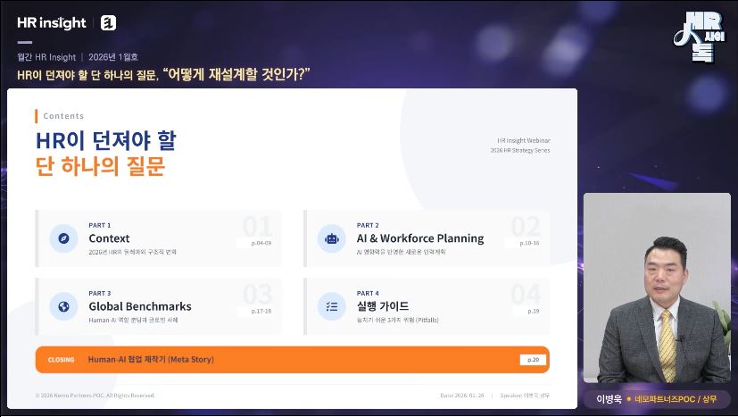 HR Insight¿Í Áß¾Ó°æÁ¦±³À°¿øÀº Áö³ 1¿ù 26ÀÏ HR Insight ¿¬°£ ±¸µ¶ÀÚ¸¦ ´ë»óÀ¸·Î ÇÑ ¿þºñ³ªÀÎ 'HRìÑ»çÀÌÅå' 1ȸÂ÷¸¦ °³ÃÖÇß´Ù. HRìÑ»çÀÌÅåÀº HR InsightÀÇ ÃÖ½ÅÈ£ ƯÁý ¼½¼Ç¿¡ Âü¿©ÇÑ ÇÊÁø°ú µ¶ÀÚ°¡ Á÷Á¢ ¼ÒÅëÇÏ´Â ¿ù°£ ¿þºñ³ª·Î, ±â»ç¿¡ ´Ù ´ãÁö ¸øÇÑ ¸Æ¶ô°ú ½Ç¹« »ç·Ê¸¦ È®ÀåÇØ °øÀ¯ÇÏ´Â ÀÚ¸®´Ù. µ¶ÀÚµéÀº »çÀü¿¡ Áú¹®À» Á¦ÃâÇϰí, ÇÊÁøÀº ÀÌ¿¡ ´ëÇØ º¸´Ù ±¸Ã¼ÀûÀÎ ½ÇÇà °üÁ¡¿¡¼ ´äÇÑ´Ù´Â Á¡ÀÌ Æ¯Â¡ÀÌ´Ù.